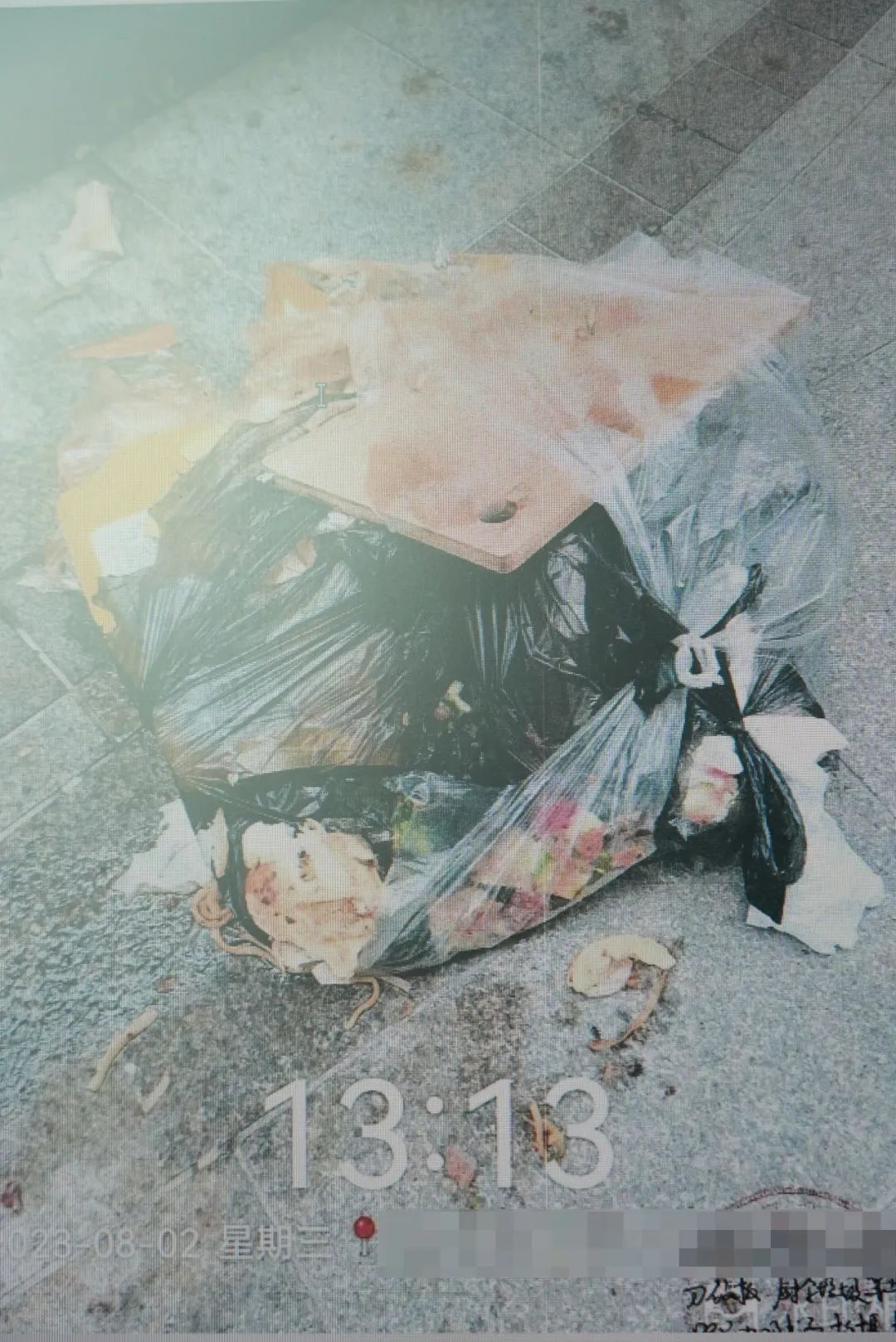 2023年8月5日上午10点左右,小区业主周先生在该栋居民楼附近散步,突然之间天降一个黑色垃圾袋。“垃圾袋就掉在离我大概一米远的位置,都炸开了,里面都是大便,还洒了几滴水出来到我的脸上。”